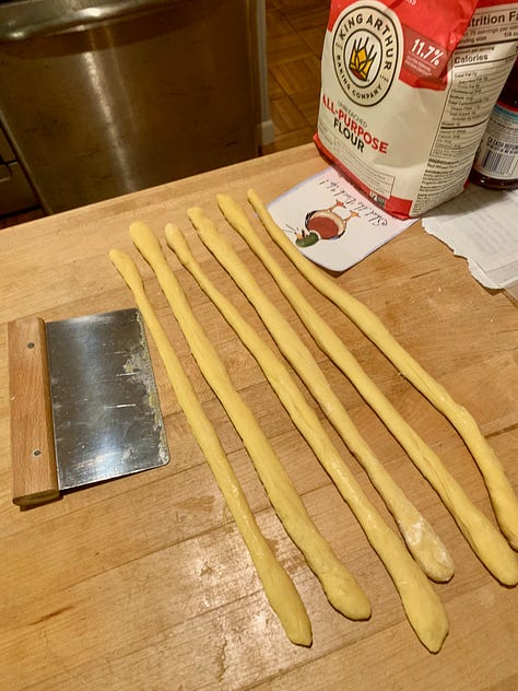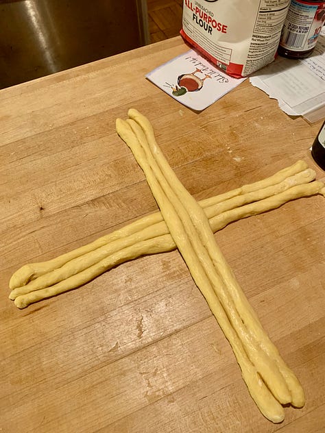 Divide into your desired portions and braid them into your loaf. A few things here…first, refrigerating the doubt for 30 minutes or so makes it a lot easier to handle when you’re rolling out your lengths for the braid. Also, how do you know how many strands to divide it into? Well, that depends on the kind of braid you want. Google it. Braiding challah. There are lots of options and directions out there. I divided mine into 6 portions and made something called the Winston Knot. This is my favorite challah shape.