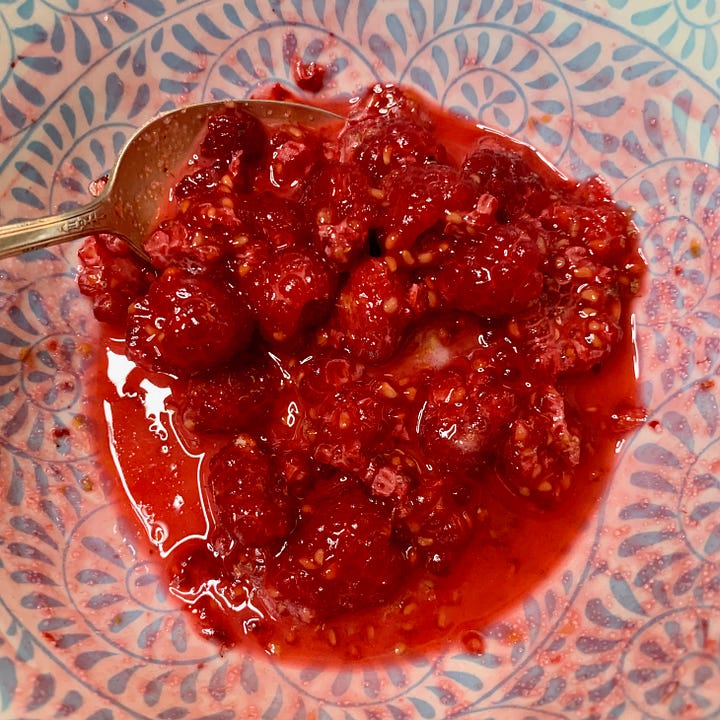 While it is baking, put the raspberries into a bowl