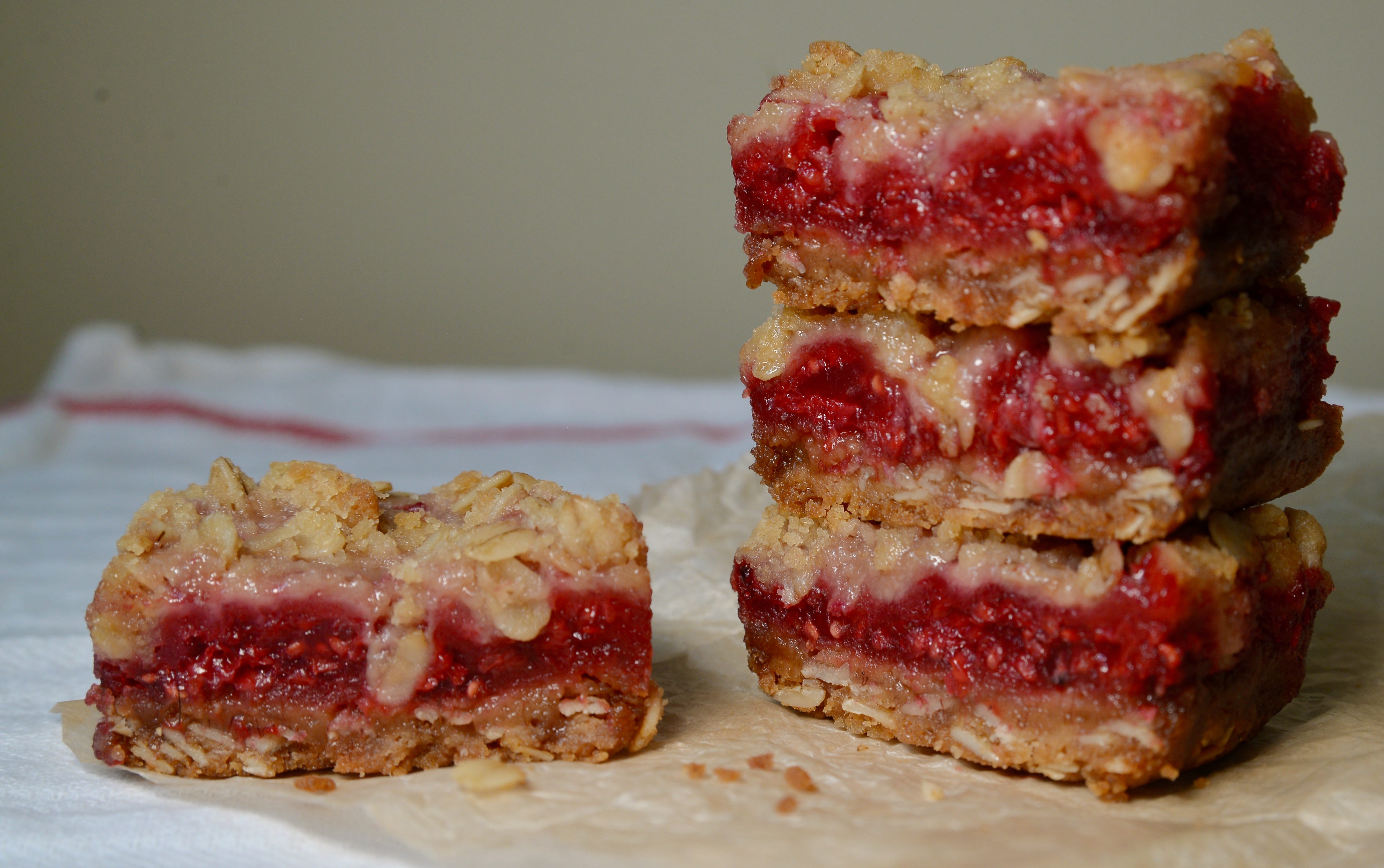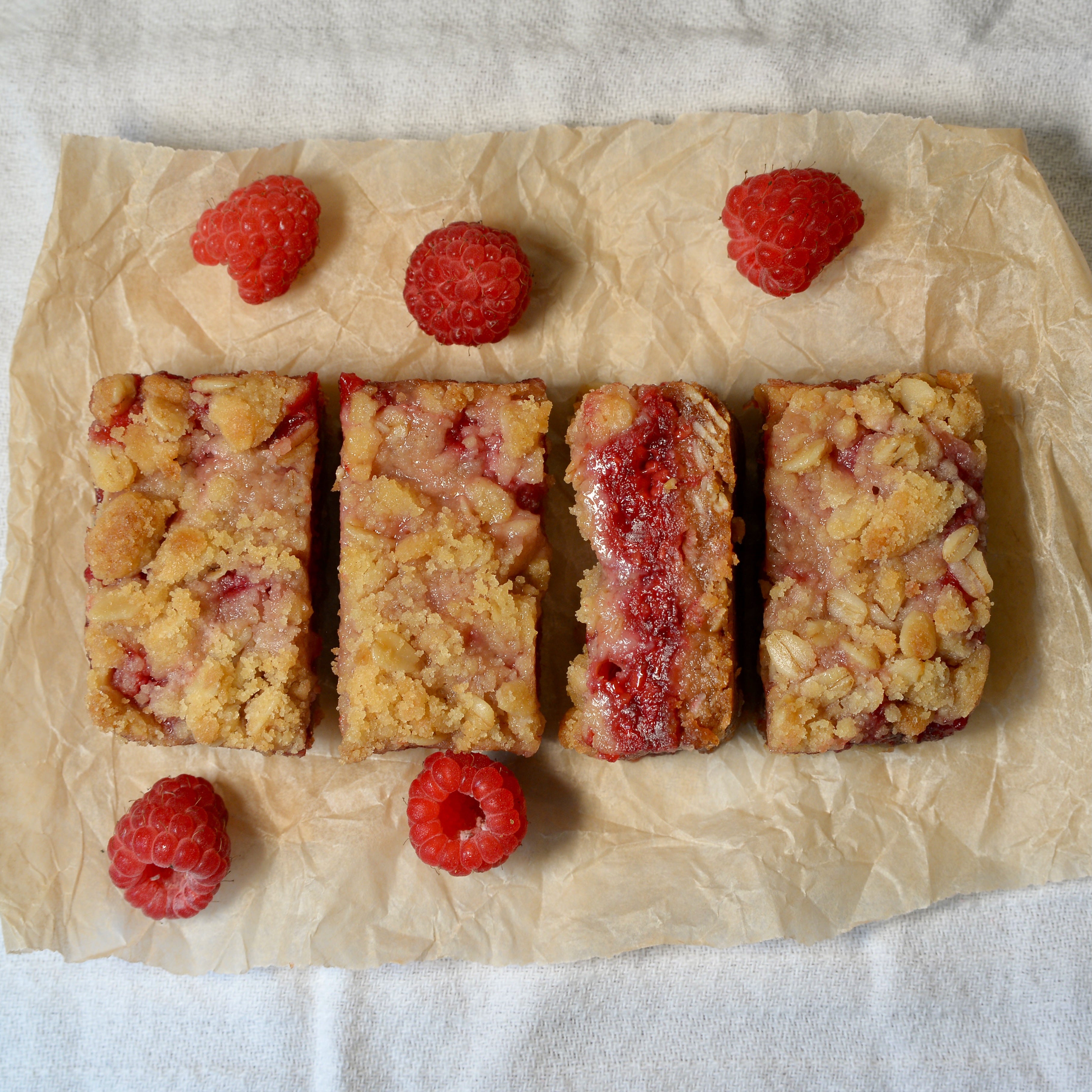 You’ll notice that I cut my bars into four pieces. While I calculated correctly for two servings, I wanted them to last longer so cut them smaller. They had a beautiful tang that accompanied the sweetness. And a really nice crisp bottom layer from pre-baking the crust that paired well with the soft sink of your teeth as you bit down from the top. I really think the fresh raspberries made these bars better. But any raspberry bars are better than no raspberry bars, so use whatever you have on hand.
